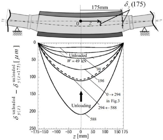 Figure 1 shows the sleeve constructed roll previously studied [,,,]. The sleeve was assembled to the shaft by shrinkage fitting. Then, the residual deflection was studied experimentally by Shimoda et al. [,,,]. The ratio of the sleeve thickness to the shaft diameter is slightly larger than the actual ratio. And the ratio of the trunk length to the trunk diameter is larger than the actual ratio in order to clarify the influence of the length []. To measure deflection, a 980 kN hydraulic press machine was used by applying 3 point bending method. To measure the residual deflection, a non-adhesive resistor linear transducer and an automatic equilibrium recorder were combined to improve the measurement accuracy. And a stylus method was used to record the distance between the roll axis parallel line and the roll. After removing the load, during the small roll rotation at a constant speed of 6 rpm, the residual deflection in the load direction was measured at the equally divided points in the axial direction.