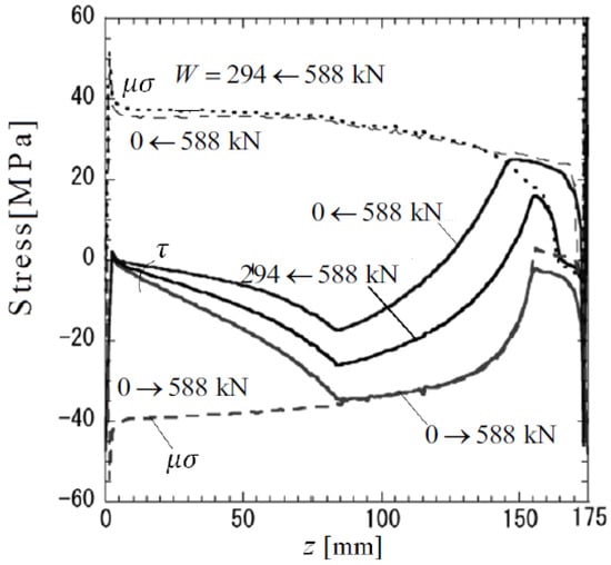 Figure 11 shows the shear stress distribution in the z-direction along the lower side of the sleeve and the shaft during unloading process. In Figure 11, based on the residual stress distribution after unloading, the stress distribution shapes are almost similar. When W = 588 kN is applied from W = 0, the negative quasi-equilibrium stress distributions are seen. When W = 294 kN and W = 0 in the unloading process, the positive quasi-equilibrium stress distributions are seen. In this way, the quasi-equilibrium shear stress direction varies depending on the loading history even though the same load is applied. During loading process, minus shear stress and during unloading process plus shear stress. As an example, Figure 12 compares stress distributions under the same load but different loading history when W = 0 kN → 294 kN under loading process and when W = 588 kN → 294 kN under unloading process. In Figure 12, the stress distributions are very different. The deflection when W = 0 kN → 294 kN under loading process is 11% smaller than the deflection when W = 588 kN → 294 kN under unloading process.