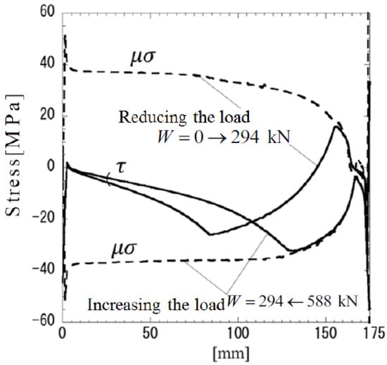 Shear stress τ and frictional stress μσ along arbor surface contacted with sleeve when W = 0 → 294 kN and W = 294 ← 588 kN (μ = 0.5).