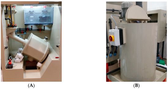 The upscaling experiments took place in a 30-L rotary leaching reactor. A 100-L tank was used for the cementation reaction (Figure 1). All solid samples like the input material and the leaching/precipitation residues were analyzed via XRF (Panalytical Axios 2005, Malvern PANanalytical GmbH, Kassel, Germany), while the composition of liquid samples was determined via inductively coupled plasma optical emission spectroscopy (ICP-OES, Spectro Arcos 2013, SPECTRO Analytical Instruments GmbH, Kleven, Germany).