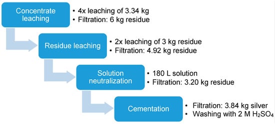 Due to a limited leaching capacity of 30 L, the s/l ratio was reduced to 1/9, i.e., 3.34 kg flotation concentrate were leached with 30 L nitric acid respectively. Silver dissolution took place in two leaching steps, first with the concentrate and afterwards with the mixed leaching residues. The leaching duration was 2.5 h each. Other parameters like temperature and acid concentration were based on the aforementioned reference trial (65 °C, 30% HNO3). The pH level of the 180 L pregnant leaching solution (PLS) was adjusted by adding approximately 65 kg of sodium hydroxide. Solid copper plates (20 × 8 × 1 cm³) were used for cementation. Moreover, all solid process residues were filtered in a vacuum aided filter system. Figure 2 gives an overview of the large scale process steps.