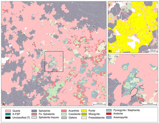 (A) Overview phase map of initial ore bearing vein; (B) Detailed view of different examples for hydraulic brecciation of sphalerite and pyrite. Fractures has been healed by quartz precipitation; (C) Detailed view of box in (A) with highlighted examples of idiomorphic textures at grain boundaries of quartz (pink) against an agglomerate of ore minerals.