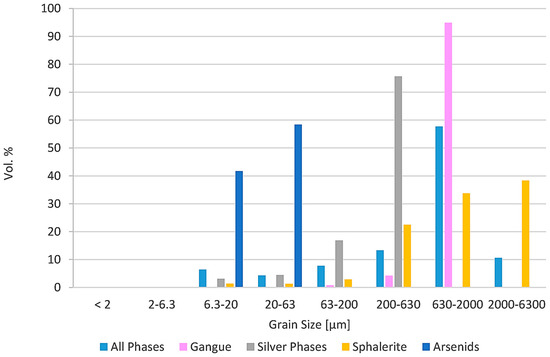 The target grain size to maximize the liberation of silver minerals was obtained by the grain size of the silver mineral aggregates, see Figure 4. More than 70% of the silver aggregates and sphalerite have a grain sizes of 200–630 µm, while quartz occurs mainly at grain sizes between 630 and 2000 µm.