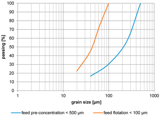 For the liberation of silver containing minerals from other accompanying minerals, the ore had to be grinded and separated based on mineral properties via different separation methods [16]. For the laboratory test work, about 40 kg of silver ore sample was used. The sample was crushed by laboratory jaw crusher to a grain size <10 mm and comminuted by roller mill in a dry grinding-screening-circuit to <500 µm (a grain size within the liberation range). The comminuted sample was split into three samples. One sample was wet screened in the four size fractions 250–500 µm, 100–250 µm, 40–100 µm and <40 µm. The first three fractions were used for pre-concentration tests by magnetic and electrostatic separation; the fraction <40 µm was not taken into consideration. The second sample was comminuted by a roller mill in a dry grinding and screening circuit to a grain size of <100 µm and split in 1 kg samples for flotation test work. A representative ore sample was used for a grain size analysis and an elemental analysis by X-ray fluorescence analysis (NITON TM XL3; Thermo Fischer Scientific, Waltham, MA, USA). The trial evaluation for all mineral processing methods is based on the analysis of generated samples via XRF, which shows similar results to the QEMSCAN© analysis.