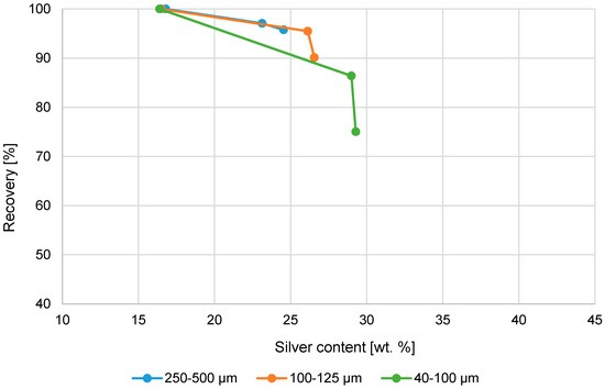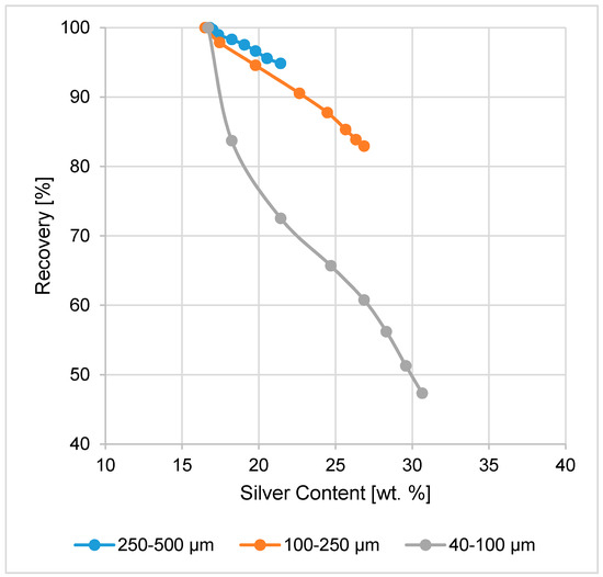 The test series show the same course in all three grain classes. The silver content increases with each cleaning stage at higher magnetic field intensity while recovery decreased. For the coarsest size fraction (250–500 µm), the highest silver content (21.4%) in the non-magnetic product was achieved after seven cleaning stages, which enabled an Ag-recovery of 94.8%. The separation of the 100–250 µm sample resulted in a non-magnetic product with a silver-content of 26.9 wt. % and a recovery of 82.9%. The separation of the 40–100 µm fraction reached the highest silver content of 31.5 wt. % in non-magnetic product at a low recovery of just 47.3%. In the first separation step of fines (40–100 µm) at a magnetic field intensity 300 mT, 16% of silver was lost in magnetic waste fraction. In the second cleaning step, the loss increased to 27% and in the seventh step the loss increased to 53% in total.