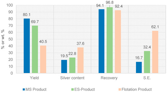 All three beneficiation techniques achieved a recovery of more than 90% of silver. The highest separation efficiency of 62.1% was achieved using selective froth flotation, followed by 32.4% by electrostatic separation. Magnetic separation achieved a low separation efficiency of 16.7%, hence not suggested for the beneficiation of the Bolivian silver ore. To reduce higher amounts of waste without losing significant amounts of valuable material, selective froth flotation shows the most promising results. It was possible to separate a mass fraction of about 59.5% at grain size <100 µm. Electrostatic separation at grain size 40–500 µm resulted in a rejected mass of 30.3%. The results are shown in Figure 8.