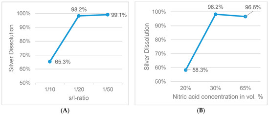 Influence of s/l-ratio (A) and acid concentration (B) on silver dissolution (fixed parameters: 1 h leaching duration, 65 °C).