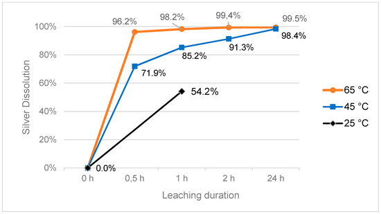 The leaching of the silver concentrate was observed for 25, 45 and 65 °C over a period of 24 h. The results given in Figure 10 reveal a strong effect of the leaching temperature on silver recovery. Already after half an hour at 65 °C, the contained silver was almost completely dissolved (96.2%). On the other hand, it took 24 h to dissolve a similar amount of silver at 45 °C. These results suggest, that the silver dissolution is temperature activated and reaction controlled. Higher temperatures were not investigated as significant vaporization and loss of NO2 already occurred at 65 °C.