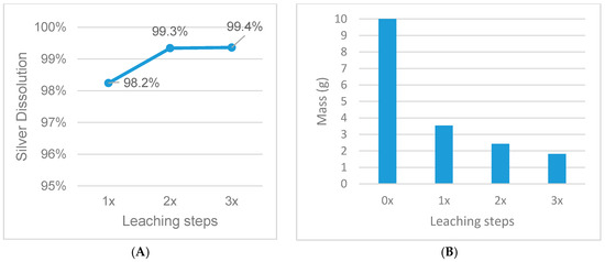 Influence of multiple-step leaching on silver dissolution (A) and mass reduction (B), fixed parameters: 30% HNO3, s/l = 1/20, 1 h leaching duration, 65 °C.