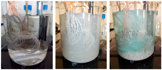 To avoid re-dissolution of precipitated silver, the corrosive solution was neutralized with sodium hydroxide before cementation took place. Suitable conditions were determined to be at pH 4–5. At pH < 4 the precipitation of impurities like iron and zinc was incomplete, which leads to a contamination of the silver cementate. Although silver hydroxide formation theoretically starts at pH 8 [20,21,22], already at pH 5 a co-precipitation could be observed, which caused an average Ag-loss of 5%. Thanks to the high copper-solution contact surface, cementation took less than 15 min for a 400 mL solution. In average 12 of 12.1 g/L silver could be recovered from the PLS via cementation. Figure 12 shows the cementation process.
