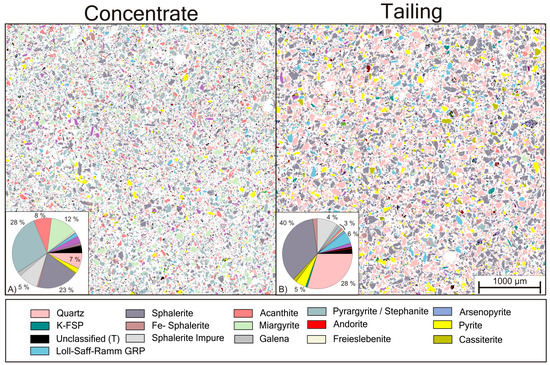 Detailed section view and modal composition (vol. %) of the minerals processing concentrate (A) and tailings (B).