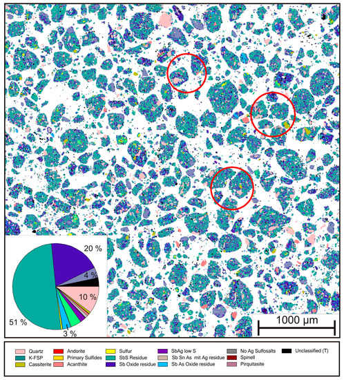 A strong intergrowth of fine-grained precipitate hinders an accurate mineralogy interpretation. Therefore, the phases are named by their chemical character. The combination of XRD and high resolution QEMSCAN investigations made it possible to clarify the mineralogical nature of those materials. The silver content of those phases varies between 2 and 10 wt. % and does not show any systematic distribution. The Ag and Sb contents lead to an interpretation that those phases originate from primary Ag-sulfosalt phases which are almost absent in this sample. However, phases like quartz, cassiterite and acanthite survived the hydrometallurgical treatment and are still present as discreet particles inside the Sb oxide/sulfide matrix. This indicates that the leaching process is not able to dissolve silver sulfides like acanthite, which shows a wide stability over variable pH and Eh conditions [17,25]. Furthermore, nitric acid was consumed by the reaction with Ag-sulfosalt phases to form Sb-Oxide phases, as mentioned above, and the resulting product/residue accumulated around particles of quartz, cassiterite and acanthite. This oxide envelope hinders further dissolution of the covered particles. Examples of those kind of particles are highlighted by red circles in Figure 15. Investigations of grain size and particle shape revealed, that quartz, acanthite and cassiterite show the same distribution on these parameters in products of minerals processing.