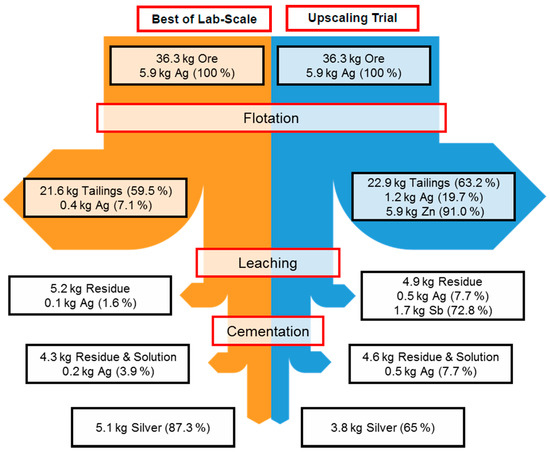 In Figure 16, a flow chart summarizing all process steps is shown. The figure shows that 87.3% of the silver could be recovered in the labscale trials, but only 65% in the upscaling experiments from the silver ore. The flotation experiments enabled an enrichment of Zn in the tailings to 25.8 wt. % and 35.2 wt. % Sb in the leaching residue contains. Because of the high metal concentrations in these side streams, they represent a potential side product to the process.