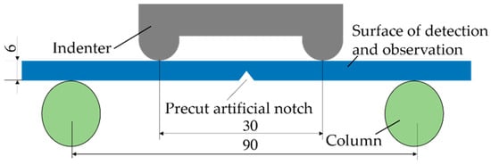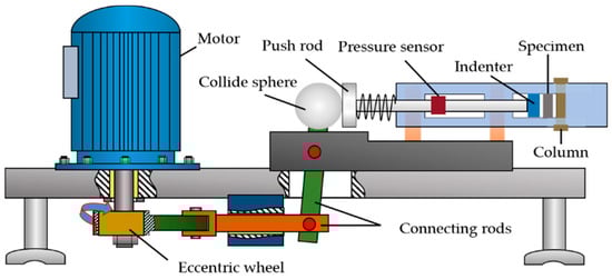 All fatigue tests were carried out on a homemade four-point bending fatigue testing machine. Figure 1 and Figure 2 are schematic diagrams of the experimental apparatus and loading, respectively. A constant amplitude fatigue test could be conducted on the test machine, whose eccentric wheel is driven by the motor, pushing colliding sphere to reciprocate back and forth. The indenter applied a load on the specimen under the action of a push rod. A pressure sensor was installed to monitor the pressure variation. The parts of the testing machine were made of non-magnetic materials to avoid interference from external magnetic field. The stress ratio “R” was zero, and frequency “f” was 5 Hz during the fatigue test.