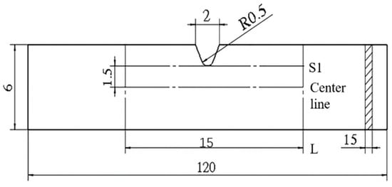 The specimen was directly cut from a new full-size API five-inch drill pipe which was made of 35CrMo steel. As a typical material of drill pipe, 35CrMo steel not only has high yield strength and ultimate strength, but also has a good impact toughness value. Its chemical composition and mechanical properties are given in Table 1 and Table 2, and the mechanical properties are represented at a room temperature of 20 ± 4 °C. The geometry of the specimen is presented in Figure 3. A small precut artificial notch, which was 2 mm wide and 1.5 mm deep, was carefully cut by a linear cutting machine on the surface of the specimen. Testing path “S1” passed the top of the notch and was parallel to the center line. The effective testing distance “L” was 15 mm. In order to provide more realistic data for MMM technique which was applied to the damage of the drillstring, the specimen maintained the original magnetic field during the fatigue test.
