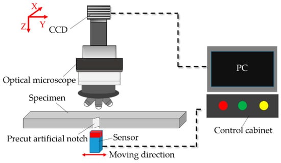 In order to observe the accumulation of plastic deformation and crack propagation on the surface of the specimen clearly, the surface of the specimen was polished with 1200 SiC paper and cleaned with ethanol and acetone prior to testing. The experiments were performed under the room temperature of 20 ± 4 °C with an ambient relative humidity of about 20 ± 5%. At the beginning of the test, the number of cycles for detection was 1 and 300. After the fatigue cycles reached 1000, the interval cycles of detection changed to 2000. The morphology of the specimen’s surface was observed with an optical microscope and a CCD camera. Meanwhile, MMM signals of the specimen surface were detected by sensor which can do reciprocating motion by use of control cabinet, as shown in Figure 4. The fatigue crack length was measured by the same scale. After the completion of the test, the crack propagation path was analyzed by scanning electron microscopy (SEM). Additionally, in order to study the crack mechanism, the metallographical structure of the specimen surface was observed. Before observation, the surface near the notch was etched in 4% nital solution at a room temperature of 20 ± 4 °C after polishing and then observed under an optical microscope.