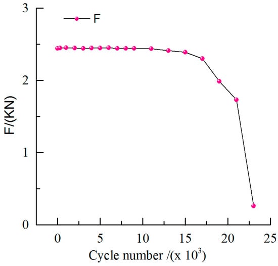 Three specimens were tested, and the results of them were similar. One of them was taken for instance, and a crack was initiated at 7000 cycles. The variation of maximum loading value “F” at different fatigue cycles is shown in Figure 5. At the beginning of fatigue test, “F” was stable. After 7000 cycles, fatigue crack initiated and fatigue specimen had obvious irreversible bending deformation. Under the condition of constant displacement loading, “F” value began to reduce. With the crack propagation, the downward trend of the “F” value became apparent, and the “F” value decreased in an accelerated manner when the fatigue specimen was approaching fracture after 19,000 cycles.