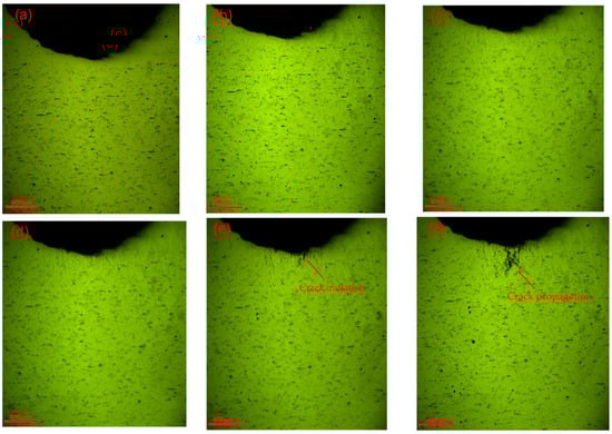 During the fatigue process, the results of the CCD camera at different cycles are shown in Figure 6. A picture was taken as a reference before the test (Figure 6a). It can be seen from Figure 6 that the variation of morphology on the specimen’s surface during the whole fatigue process could be divided into approximately three stages: the initial stage (before 300 cycles), the steady stage (300 to 7000 cycles), and the crack propagation stage (after 7000 cycles). In the initial stage, plastic deformation appeared and intensified significantly as the number of fatigue cycles increased (Figure 6a–c). Dislocation densities had an approximate linear relationship with the plastic deformation [,], so the increase of plastic deformation represented the accumulation of dislocation. After 300 cycles, dislocation blockings [] near the notch appeared after the rapid accumulation of plastic deformation in the initial stage, and plastic deformation stopped growing rapidly (Figure 6c,d). The coalescence of growing dislocations resulted in crack initiation in the maximal stress concentration area, as shown in Figure 6e. There were many microcracks formed by plastic deformation accumulation around the main crack propagation path at the early stage of crack propagation (Figure 6f) and, afterward, the length of the crack grew steadily with the increase in the number of fatigue cycles (Figure 6g). The fatigue specimen had severe irreversible bending deformation when approaching fracture (Figure 6h).