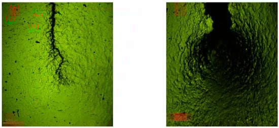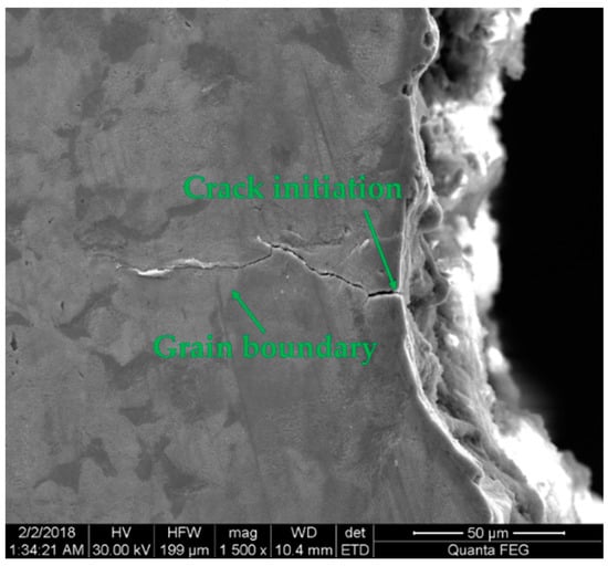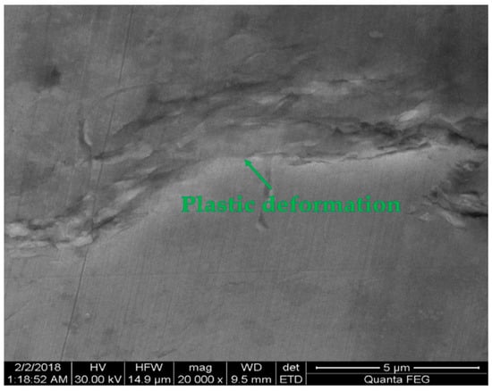 The specimen’s surface was observed along the crack propagation path by SEM at high magnification (Figure 8), and the results showed that there were a large number of secondary microcracks and plastic deformation along the main crack propagation path after specimen fracture, which demonstrated that the specimen’s surface morphology after crack initiation included both the plastic deformation and microcracks in Figure 6e–h. The morphology of crack initiation zone (Figure 8d) was caused by including the fatigue accumulation before the crack initiation (Figure 6a–d) and early crack propagation (Figure 6f), in which the fatigue accumulation at the early crack propagation (Figure 6f) led to the formation of secondary microcracks in crack initiation zone (Figure 8d). In addition, the specimen’s surface away from the crack initiation zone had obvious plastic deformation in Figure 9, where there were no microcracks, which indicated that the variation of the specimen surface morphology before crack initiation (Figure 6a–d) was caused by plastic deformation accumulation again. This was because the surface morphology away from the crack initiation zone was less affected by fatigue accumulation after crack initiation, which was preserved as the variation of the surface morphology before the crack initiation. The final fracture zone had a large amount of plastic deformation accumulation and secondary microcracks (Figure 8c,f), which were caused by the severe irreversible bending deformation in Figure 6h.