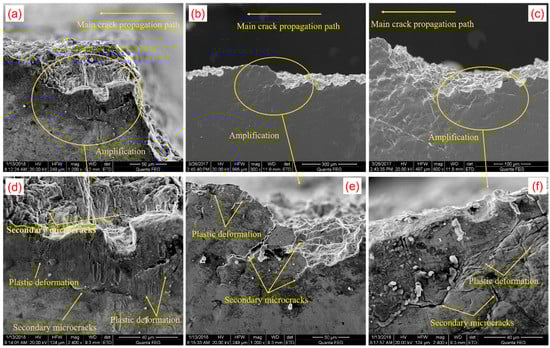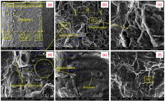 Morphologies of specimen surface through SEM along the main crack propagation: (a) crack initiation zone; (b) crack propagation zone; (c) final fracture (d) amplification of the crack initiation zone; (e) amplification of the crack propagation zone; and (f) amplification of the final fracture zone.