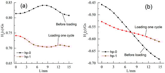 MMM signals of the specimen before and after load: (a) Hp(x); and (b) Hp(y).