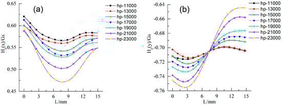 As indicated in Figure 12a and Figure 13a, all Hp(x) signals exhibited a consistent tendency during the fatigue process. Each curve had a trough at the notch. Hp(x) signal curves declined dramatically before 300 cycles with the increase of fatigue cycles. After that, Hp(x) signal curves were stable from 300 to 7000 cycles. When the fatigue crack initiated and entered the crack propagation stage, the Hp(x) signal curves continued to decrease. After 19,000 cycles, Hp(x) signal curves decreased in an accelerated manner.
