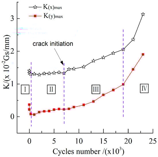 As shown in Figure 14 and Figure 15, the variation of Hp(x)min, K(x)max and K(y)max at different fatigue cycles could be divided into four stages: