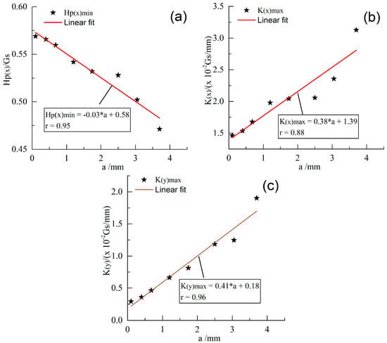 The relationship between the characteristics and the length of the crack propagation after linear fitting: (a) Hp(x)min; (b) K(x)max; and (c) K(y)max.