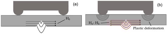 In the initial stage, the residual stress of the specimen accumulated rapidly because of the increase of plastic deformation from 0 to 300 cycles (Figure 6a–c). The equivalent magnetic field Hσ formed by the residual stress was opposite to the initial magnetic field H0 near the notch, which resulted in a decrease in the magnetic field of specimen surface (Figure 17). Consequently, the values of Hp(x)min, K(x)max and K(y)max declined rapidly.