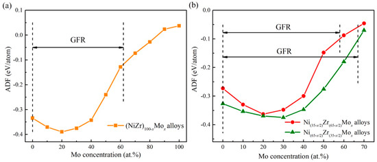 - Yang, M.H.; Li, N.; Li, J.H.; Liu, B.X. Effects of Mo addition on the metallic glass formation of (ZrNi)100−xMox alloys. J. Alloys Compd. 2014, 606, 7–10. [Google Scholar] [CrossRef]