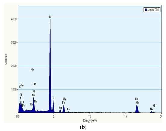 Precipitation of carbonitride (Ti,Nb)(C,N) with numerous small dispersive precipitates corresponding to the hardening of the steel. (a) recipitation of carbonitride (Ti,Nb)(C,N); (b) large particle-related EDX spectrum.