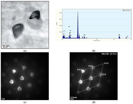 Dispersive precipitation of carbides (Ti,Nb)C in S700MC steel limiting the growth of recrystallized austenite grains. (a) dispersive precipitation of carbides (Ti,Nb)C; (b) EDX spectrum; (c) diffraction pattern; (d) diffraction pattern solution.