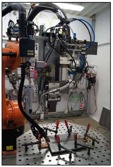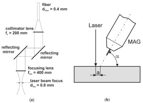 The welded joints were made at Welding Institute in Gliwice using a robotic station (Figure 5). The tests were performed using a TruLaser Robot (TRUMPF, Stuttgart, Germany) 5120 cell-equipped with a TruDisk 12002 disc laser (TRUMPF, Stuttgart, Germany) having a power of 12,000 W (wavelength λ = 1030 nm) and an EWM Phoenix 452 RC PULS (EWM AG, Mündersbach, Germany) synergic power source. The hybrid welding head (laser beam-MAG) was fixed on the robot’s wrist. The focal length of the laser optics collimator was fc = 200 mm, whereas the focal length of the focusing lens amounted to ffoc = 400 mm. The diameter of the optical fibre supplying energy from the laser to the robot was dfiber = 0.4 mm. The above-presented arrangement of the optics made it possible to obtain a laser beam focus diameter dfoc = 0.8 mm (Figure 6). The electrode extension was l = 18 mm. The shielding gas used in the tests was mixture M21 (18% CO2 + 82% Ar), whereas the gas flow rate amounted to 18 dm3/min. The filler metal was solid wire GMn4Ni1.5CrMo having a diameter of 1.2 mm. The welding process was carried out in one pass. The electrode was inclined in relation to the welded surface at angle α = 65°, whereas the distance between the electrode tip and the laser beam was a = 2 mm (Figure 6). The parameters used when making the joint (adjusted on the basis of preliminary tests [32,33]) are presented in Table 3.