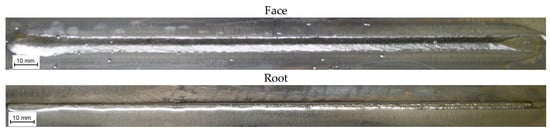 The visual tests and the magnetic particle tests of the welded joint did not reveal surface-breaking welding imperfections, such as cracks, porosity, incomplete fusion, or a lack of penetration (Figure 7). The radiographic tests did not reveal the presence of internal welding imperfections. The welded joint satisfied the requirements related to quality level B according to ISO 12932. The macroscopic metallographic tests did not reveal the presence of welding imperfections in the weld and HAZ (Figure 8). Excess penetration in the weld root was related to the shape and dimensions of the copper strip used during welding.