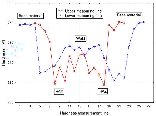 Hardness of the hybrid weld joint (laser beam-MAG) made of S700MC steel (position of measuring lines 2 mm from the top and bottom surface of the sheet).
