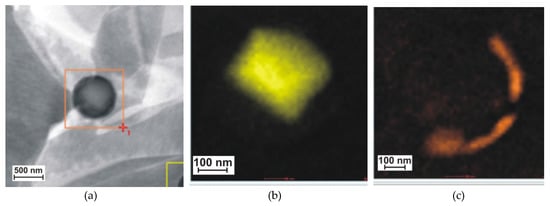 Titanium-niobium precipitates in the hybrid welded joint made of steel S700MC. (a) precipitate; (b) surface distribution of titanium; (c) surface distribution of niobium).