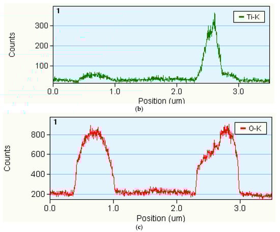 Spherical TiO precipitates in the hybrid welded joint made of steel S700MC. (a) precipitates; (b) linear analysis EDS of titanium concentration; (c) linear analysis EDS of oxygen concentration.