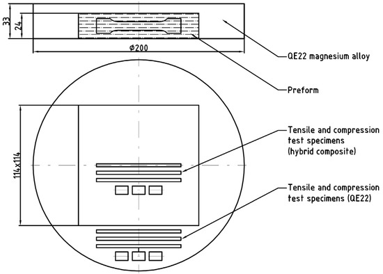 Cast magnesium alloys based on the Mg–Al–Zn–Mn system are designed for applications at ambient temperatures because the mechanical properties of these alloys rapidly deteriorate at elevated temperatures (above 120 °C) [1,2]. Among alloys for application at higher temperatures, the commercial QE22 is one of the most frequently used. Improvement in mechanical properties can be achieved using a proper thermal treatment [2] or, improving thermal stability as well, using various reinforcements that exhibit different mechanical and physical properties. Magnesium matrix composites show better wear resistance, enhanced strength, and creep resistance. Furthermore, they retain low density and good machinability [3,4]. Appropriate materials for the reinforcing phases are ceramics: oxides, nitrides, borides, carbides, carbon nanotubes (CNT), or intermetallic compounds [5,6,7,8,9,10,11]. The behavior of composites depends on the content, geometry, and physical and mechanical properties of the reinforcing phases. Metal matrix composites (MMCs) with long fibers, originally used to strengthen a plastic metallic composite matrix, exhibit several disadvantages, such as high anisotropy and low mechanical stability, since fibers are pulled out from the matrix under loading. Extremely high anisotropy is partially suppressed in composites reinforced with short fibers or whiskers [12,13,14,15,16,17]. This anisotropy may vanish in composites reinforced by particles [18]. On the other hand, mechanical properties of the particle-reinforced composites are inferior compared with fiber-reinforced composites. Using a combination of fibers and particles has proven to be a convenient compromise [19,20,21,22,23,24]. Reinforcing fibers/particles increases stiffness [25], improves mechanical and creep properties [19,20,21,22,23,24], and decreases the thermal expansion [26] of the composite. Nanocomposites with a reinforcing phase size of up to 100 nm have been intensively studied in the last decade [27,28,29,30,31]. Magnesium-alloy-based (nano)composites have been considered a material suitable for biomedical applications in the last few years [32]. Al2O3 ceramic Saffil fibers and SiC particles (SiCp) are commonly used reinforcements for Mg alloys. A combination of both materials, where Saffil fibers are replaced by cheaper SiC particles, may deliver a material with excellent strength, acceptable plasticity, improved creep properties, and enhanced wear resistance when compared to a mere fiber-reinforced composite with an Mg matrix. If composites are prepared via the hot extrusion technique, mechanical and physical properties are also influenced by the material texture [26]. Bonding between the metallic matrix and the reinforcing phase significantly affects the resulting properties of MMCs [33]. The presence of fibers/particles may also influence the precipitation processes in the metallic matrix during the composite preparation [34]. The chemical composition of magnesium alloys can be chosen according to the required mechanical properties of the composite matrix, considering the strengthening effect of the reinforcing particles/fibers. Rare earth element (RE) additions increase the strength of magnesium alloys at elevated temperatures and reduce weld cracking and casting porosity. The relatively weak tensile properties of Mg–RE–Zr alloys can be improved by an addition of Ag, which results in enhanced thermal treatment possibilities and age hardening processing of the alloy and final composite. QE22 is a widely used Mg–Ag cast alloy, where the content of silver below 2% allows for the formation of Mg–Nd precipitates similar to the Mg–RE alloys; the addition of silver also refines the precipitate size [2].