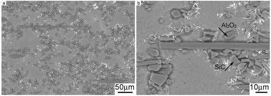 The microstructure (BSE mode) of the hybrid composite (a); a closer view of a fiber surrounded by SiC particles (b).