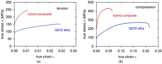 True stress–true strain curves of the QE22 matrix alloy and the hybrid composite in tension (a) and compression (b).