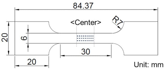 Hardness testing was conducted to observe the changes in hardness in the alloy with different amounts and lengths of pre-straining and aging time, respectively. The measurements were operated using a Vickers microhardness tester (HM-100, Mitutoyo, Kanagawa, Japan) with a load of 100 gf and a dwell time of 12 s. An average Vickers microhardness value, Hv, was estimated from the 27 separate measurements with intervals of ~1 mm at the central region of each gauge length. The detailed locations of hardness measurements are shown in Figure 1.