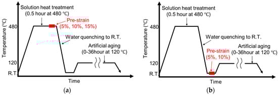 Experimental schedules of the T6 treatment conditions with pre-straining at (a) 480 °C as hot-stamping and (b) RT after quenching.