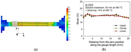 (a) A representative strain map for the specimen strained for 15% at 480 °C, where the measurement locations at three sections of upper, center, and lower are shown in black, yellow, and red dots, respectively, and the individual values of strain are represented by a set of unique color keys; and (b) variation of strain versus distance from the zero position at the three separate measurement sections along the gauge length in the Al 7075 after straining for 15% at 480 °C.