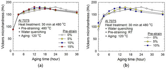 The variations of Vickers microhardness with aging time are shown in Figure 5 for the alloy with different amount of pre-strain at (a) 480 °C and (b) RT. In each plot, there is a datum line of 0% strain indicating the hardness of the material without any pre-straining procedure during the series of heat treatments. Error bars are not included because of very small difference in Hv of ±1 at each testing condition. The sample without pre-strain shows the hardness of Hv ≈88 immediately after quenching prior to aging (0 h of aging time) and the peak aging hardness of Hv ≈180 after aging for 24 h at 120 °C, where the hardness value is consistent with the reference value of 175 for an Al 7075-T6 [].