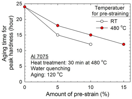 Importance of pre-straining before aging was demonstrated by Wang et al. where the combination of pre-straining with a two-step aging process improved both the strength and stress corrosion cracking resistance of an Al 7050 alloy []. Moreover, both bake-hardening and maximum yield strength was improved by an increasing amount of pre-strain up to 6% before a baking/aging treatment on an Al 7075 alloy [] and the result is consistent with the baking behavior after pre-straining of an Al–Mg–Si alloy []. Furthermore, pre-straining before aging significantly increased the peak aging hardness and shortened the peak aging time of the Al–Mg–Si–Cu alloy [].