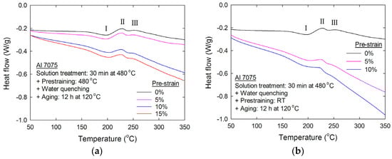 Figure 8 shows the DSC curves for the Al 7075 after a series of aging treatments with pre-straining at (a) 480 °C before quenching and (b) RT after quenching prior to aging, where the both plots include the DSC curve for the Al 7075-T6 without pre-straining for comparison purposes. It is apparent in both plots that there are clear peaks for the reaction stages of I–III where the reaction peak III is generally small [,,,,]. Thus, all samples demonstrated the dissolution of GPZs at ~195–200 °C and the formation of η′ and η at ~225–230 °C and ~245–255 °C, respectively, while there were very weak or unrecognizable peaks indicating the stage IV at ~320 °C for the dissolution of η in the present experimental conditions.