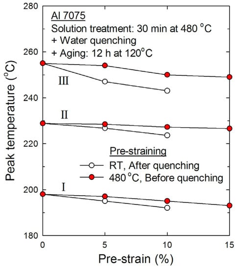 The peak reaction temperatures for separate precipitation reaction stages I–III with the amount of pre-strain at 480 °C and RT on the Al 7075.