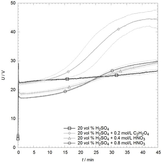 Voltage curves for the galvanostatic anodic oxidation process (current density: 3 A/dm2) in the sulphuric acid base electrolyte with and without various additions. The thin lines represent the 66% confidence intervals, i.e., the standard deviation.