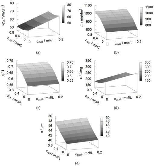 Effect of the addition of oxalic and nitric acid on the coating and process properties as predicted by the response function, (a) electrical energy consumption Wel, (b) oxide mass m, (c) current efficiency η, (d) energy efficiency ε, (e) coating thickness s.