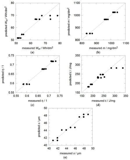 Comparison between values predicted by the response function and measured values for (a) electrical energy consumption Wel, (b) oxide mass m, (c) current eciency η, (d) energy efficiency ε, (e) coating thickness s.